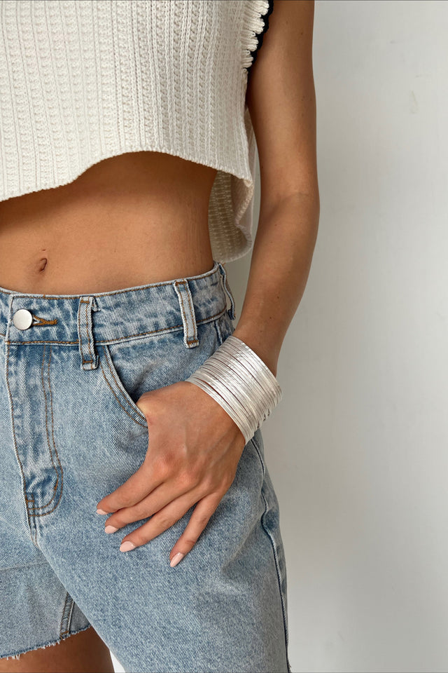 This chunky cuff bracelet comes in a gorgeous matte silver, and features a 22 strand layer. This will add just the right amount of arm candy to any outfit! Measures 2